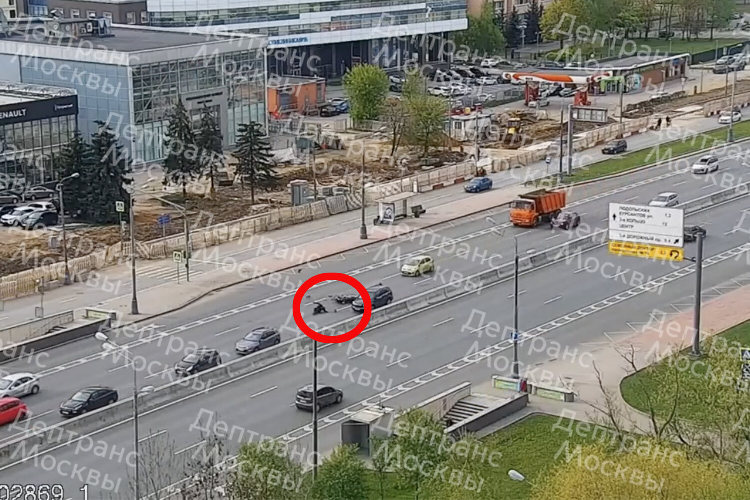 На кадрах с камеры наблюдения видно, что легковой автомобиль, двигавшийся в левом ряду, затормозил вслед за другими машинами. В этот момент в заднюю часть машины врезался мотоциклист. От удара он упал с мотоцикла и проскользил по асфальту в сторону правой обочины. О состоянии пострадавшего не сообщается. На месте происшествия работают оперативные службы, движение в районе аварии затруднено.