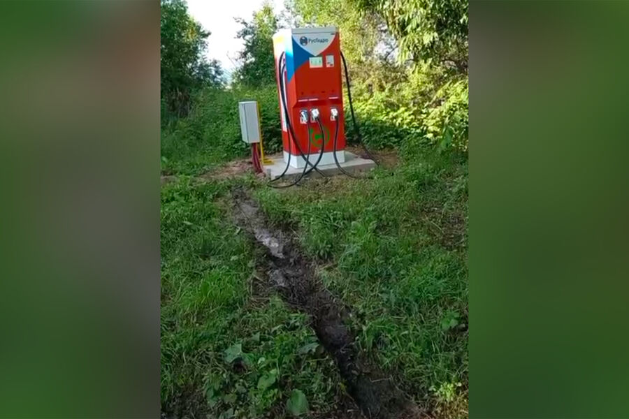 По словам женщины, снявшей видео, станция установлена в болоте, поэтому никаких условий, чтобы зарядить машину нет. Машины буксуют при попытке подъехать к заправке.