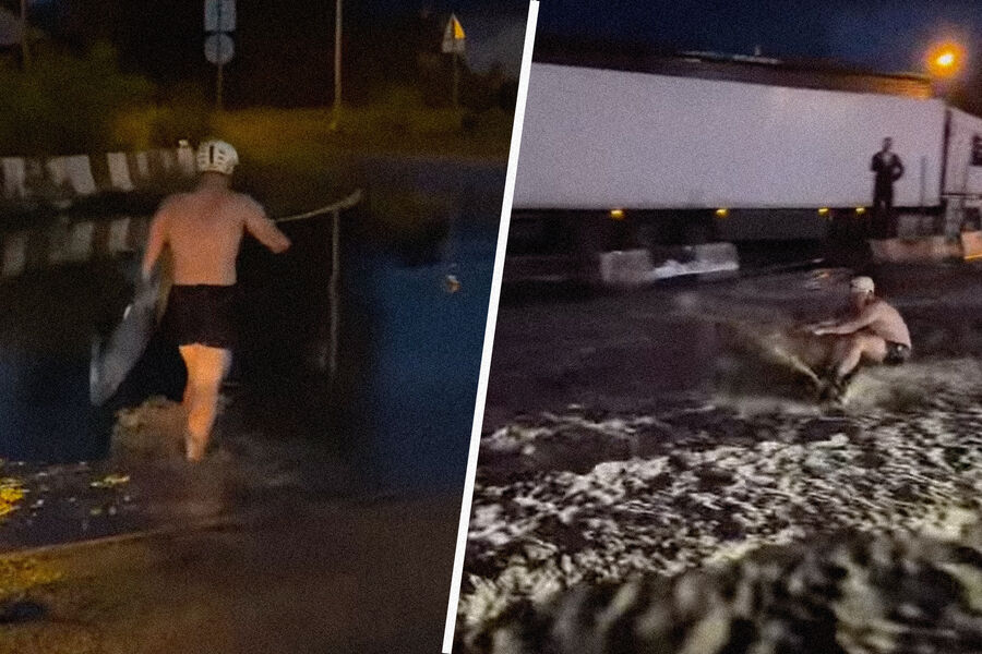По данным канала, местный экстремал Дмитрий давно обратил внимание, что в городе во время дождя серьезно затапливает улицу Лазо. 4 июля после нескольких дней проливных дождей мужчина решил проехать по ней на вейкборде. В качестве буксира выступал внедорожник.