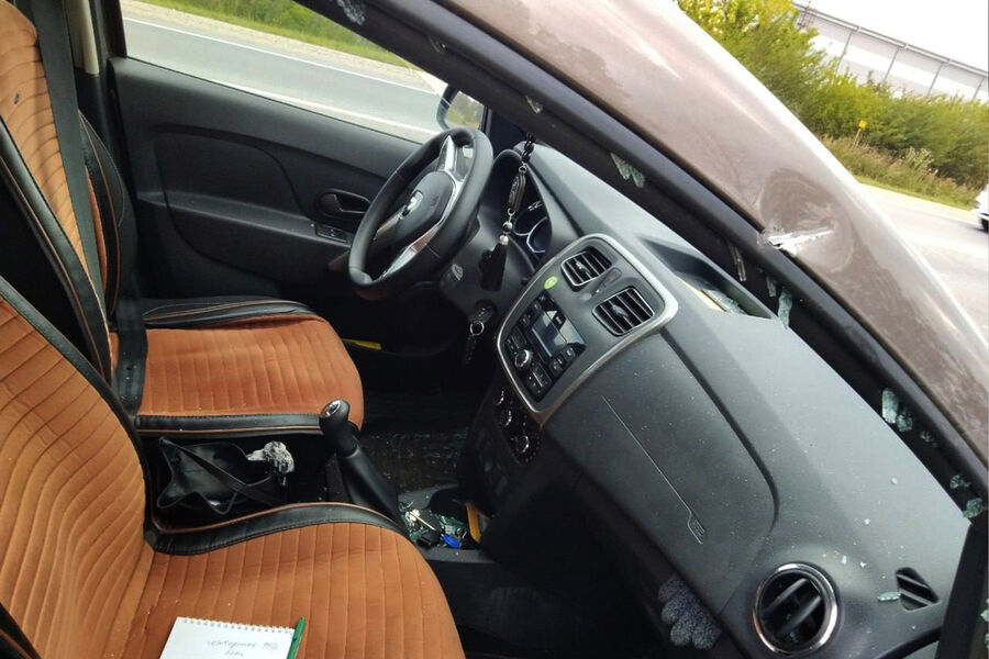 Инцидент произошел возле Челябинского компрессорного завода. Предмет ударился о кузов легкового автомобиля с такой силой, что разбилось стекло в передней пассажирской двери. Кроме того, у машины пробита передняя стойка. По данным канала, справа от женщины-водителя Renault сидел 10-летний ребенок. Обломок железа чудом не попала в него. Женщина успела среагировать и вывернула руль. Это и спасло ее сына.