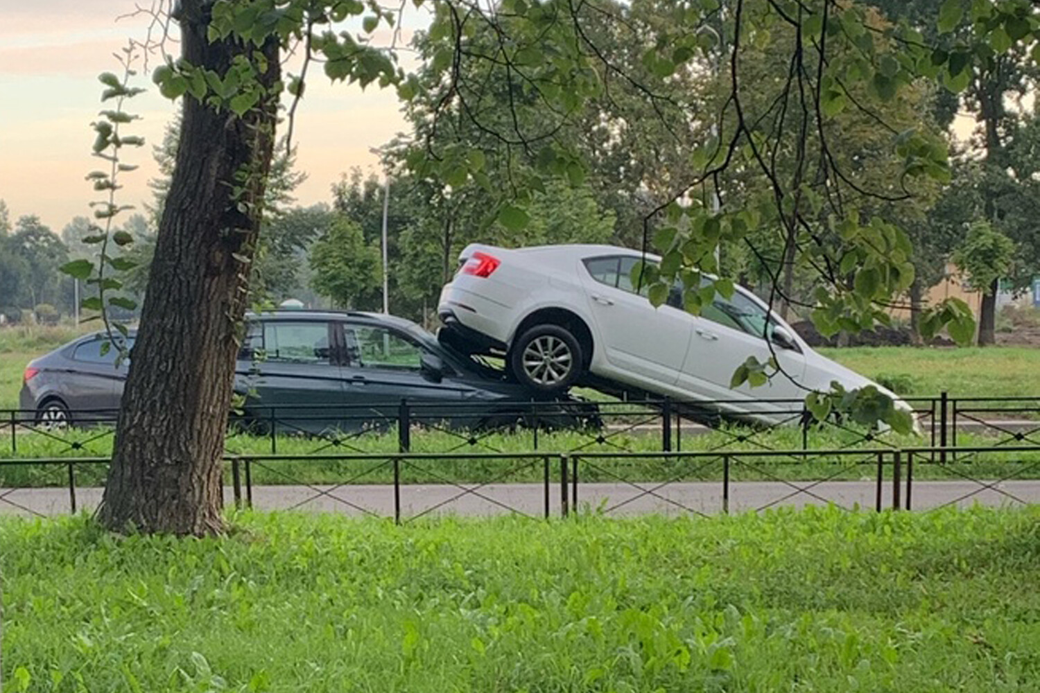 В Санкт-Петербурге водитель легковушки столкнулся с одной припаркованной машиной, забросив ее на другую. Об этом рассказали очевидцы в сообществе «ДТП и ЧП | Санкт-Петербург», опубликовав запись происшествия.
