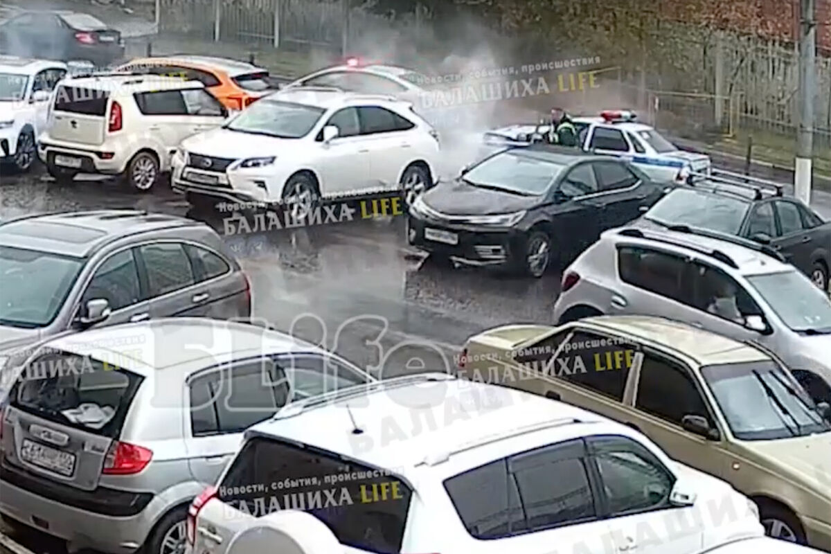 ДТП произошло на Октябрьской улице в микрорайоне Железнодорожный. Водитель кроссовера в раскраске каршеринга лоб в лоб протаранил служебный автомобиль ДПС на встречной полосе и врезался в припаркованные машины. На кадрах с камеры наблюдения видно, что полицейская Lada Priora с включенными спецсигналами движется вдоль припаркованных автомобилей. Спустя несколько секунд после того, как автомобиль ДПС выехал из кадра, в противоположном направлении проехал автомобиль каршеринга, протаранивший припаркованный вне проезжей части кроссовер Geely, который отбросило на седан Renault.