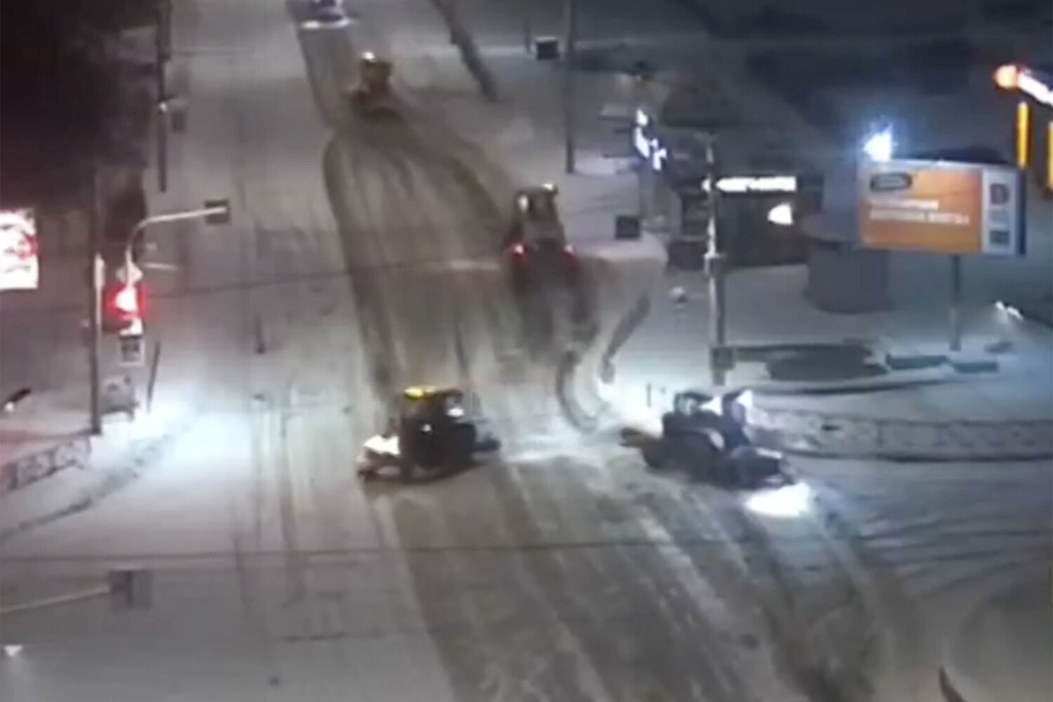 На видеозаписи с камеры наблюдения видно, что два трактора отделились от колонны снегоуборочной техники, убиравшей проезжую часть, и остались на перекрестке. Их водители начали ездить по кругу в управляемом заносе. При приближении автомобилей трактористы разъехались в сторону, давая возможность водителям машин проехать перекресток.