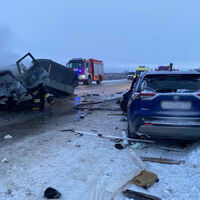 Пожарные потушили загоревшуюся машину. На кадрах с места происшествия видно, что у бортового грузовика УАЗ в результате ДТП переломилась рама и оторвалась кабина. Еще у двух легковых автомобилей наблюдаются сильные механические повреждения передней части. Всего в столкнувшихся автомобилях ехали 11 человек.