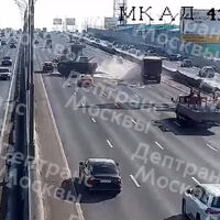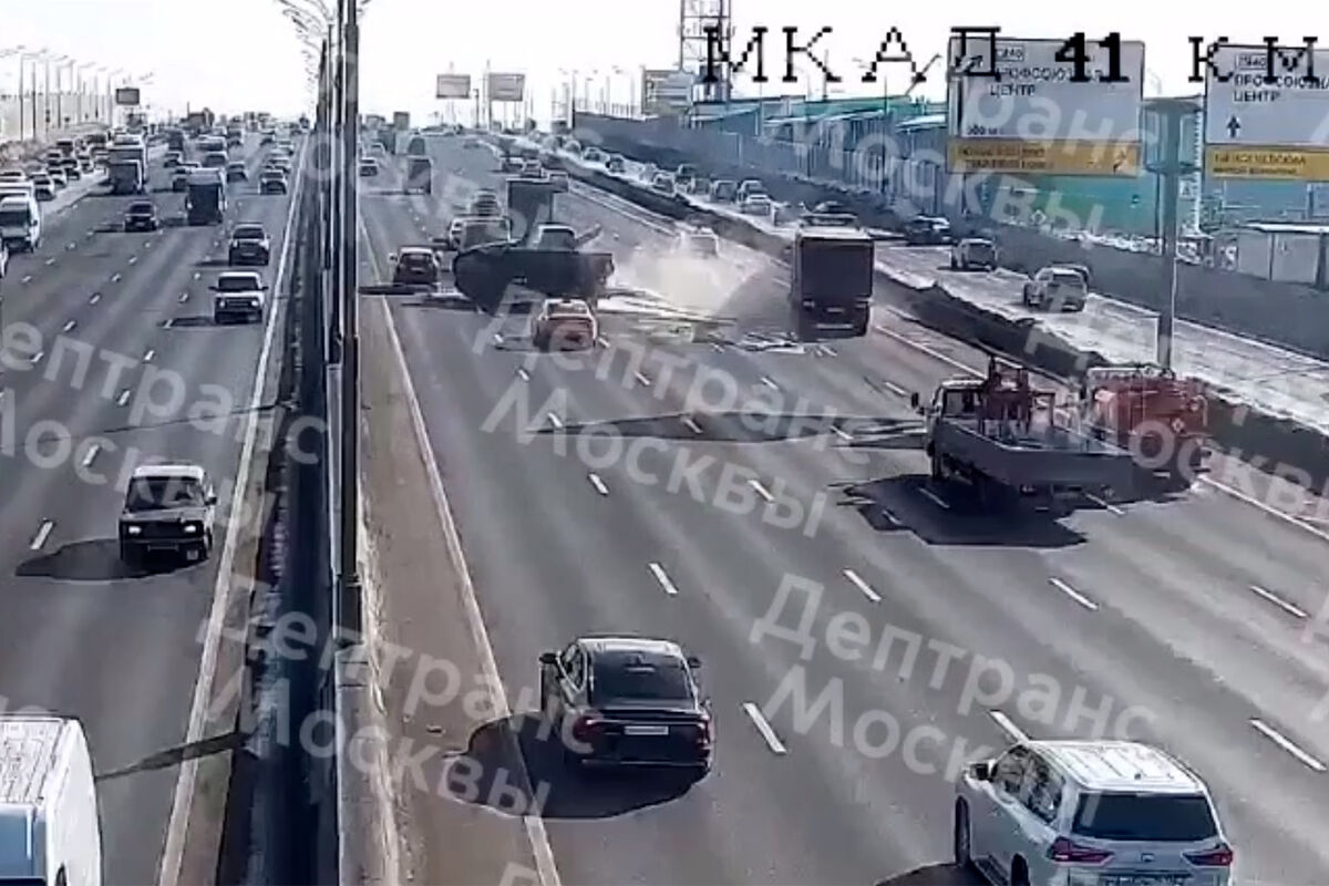 На внешней стороне 41 км МКАД столкнулись два грузовика, один из них опрокинулся. Кадры с ДТП опубликовал столичный Дептранс в своем Telegram-канале.
