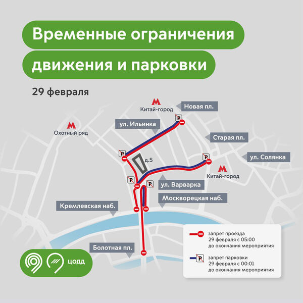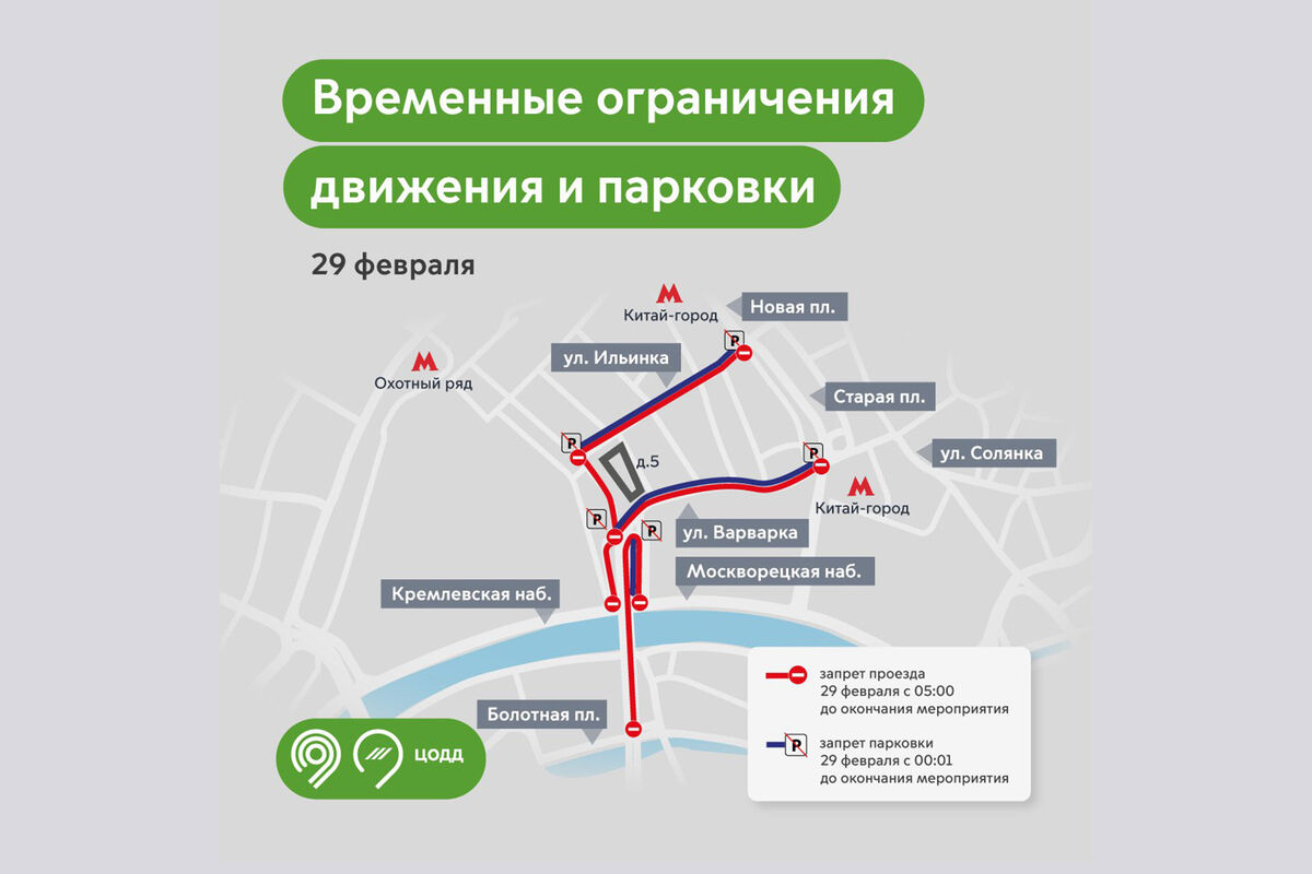 «29 февраля с 05:00 до окончания мероприятия будет временно закрыто движение на улице Варварка от Китайгородского проезда до Большого Москворецкого моста, на улице Ильинка от Новой площади до Красной площади, на улице Москворецкая от Большого Каменного моста до Кремлевской набережной», — заявили в ведомстве.