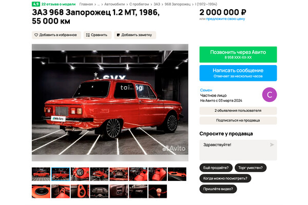 В Екатеринбурге выставили на продажу автомобиль ЗАЗ-968 «Запорожец», выпущенный в 1986 году. За машину продавцы просят два миллиона рублей. Объявление опубликовано на сайте «Авито Авто».