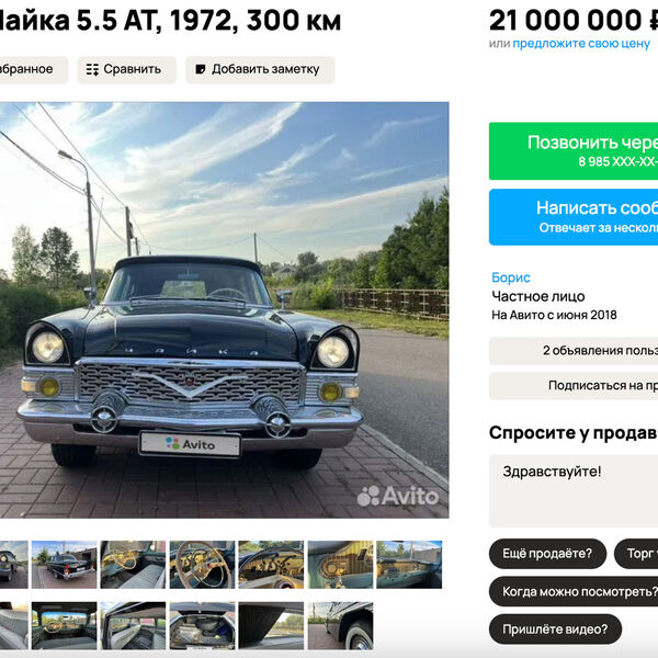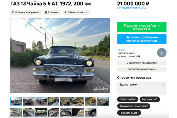 На «Авито» продается ГАЗ-13 «Чайка», выпущенная в 1972 году. Машина находится в Москве. Об этом сообщает «Российская газета». Цена машины — 21 млн рублей.