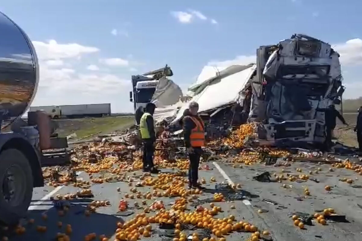Судя по видео, в одном из грузовиков находились фрукты, которые рассыпались по дороге после ДТП.