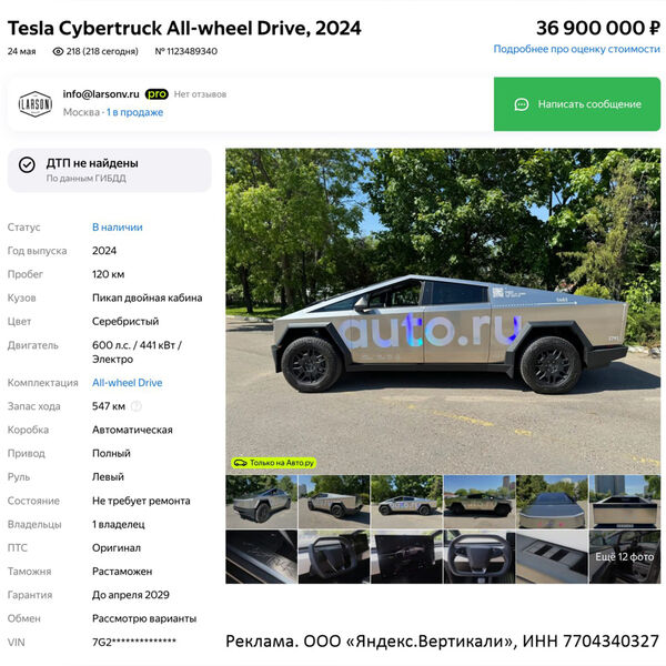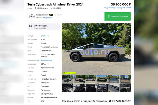 В сети появилось объявление о продаже Tesla Cybertruck в России. Продавец опубликовал его на «Авто.ру».
