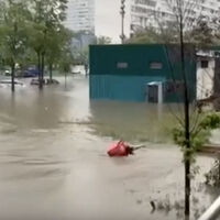 На видео показано, как курьер с заказом на спине плывет по огромной луже, которая появилась в Москве в результате суперливня. Судя по форме, на видео попал работник «Самоката». Примечательно, что человек рядом с курьером стоит в воде по колено. Вероятно, что поплавать в луже мужчина решил по собственному желанию.