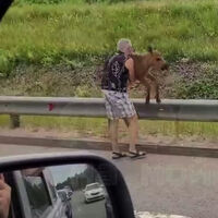 В Санкт-Петербурге водитель решил помочь молодому лосю перейти дорогу и поднял его на руки. Об этом сообщает Telegram-канал «Mash на Мойке».