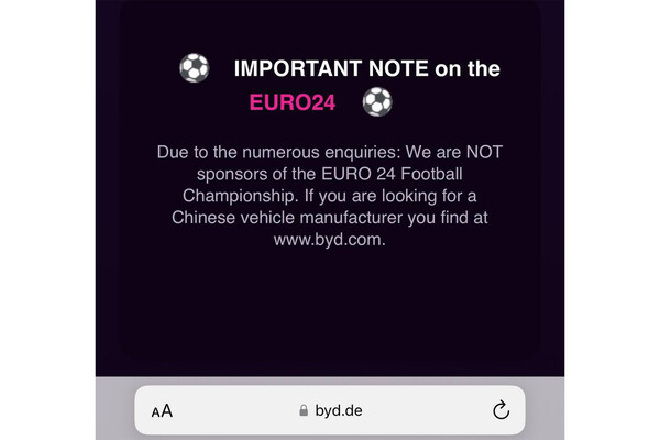 Примечательно, что BYD выступает спонсором футбольного Евро-2024. В связи с этим болельщики из Германии, которые захотели больше узнать о бренде, пытались найти его сайт в сети, однако вместо него попадали на портал секс-шопа Buy Your Dildo (byd.de.). При этом .de — национальный домен страны. В итоге магазину для взрослых пришлось вывесить объявление на сайте: «Если вы ищете китайского производителя автомобилей, вы найдете его на www.byd.com».