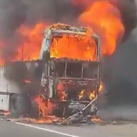 На кадрах видно, что белый пассажирский автобус объят огнем. Он стоит на обочине. Рядом с ним находятся пожарные. Информации о пострадавших не поступало.