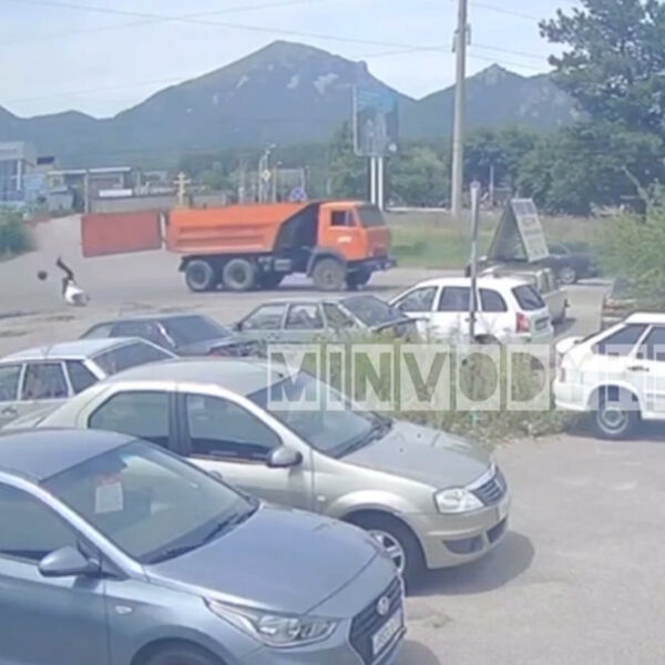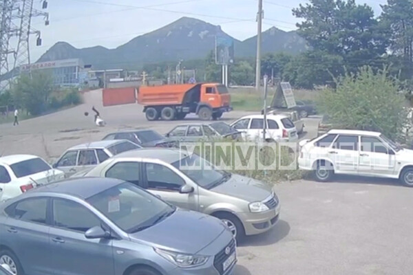 В Пятигорске открывшийся на ходу задний борт самосвала «КамАЗ» ударил по голове инспектора ДПС, стоявшего у края дороги. Видеозапись инцидента опубликовал Telegram-канал «Minvodyhelp (Наш Город)».