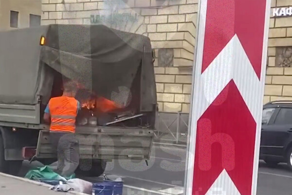 В Санкт-Петербурге водитель голыми руками достал горящий генератор из «Газели». Кадры опубликовал Telegram-канал «Mash на Мойке».