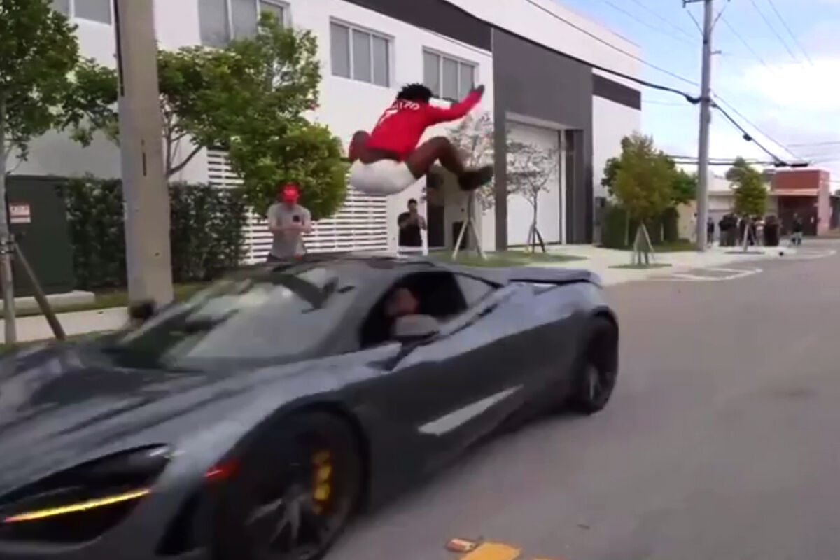 На видеозаписи видно, как блогер в красной футболке и шортах дает команду водителю, и, как только автомобиль Lamborghini на большой скорости подъезжает к нему, прыгает вверх. В это время машина благополучно проезжает под ним. Спустя несколько секунд он проделывает тот же трюк с другим спорткаром. Успешно пропустив другую машину, он громко кричит и радуется совершенному. Блогера поздравили зрители, стоящие на тротуаре.