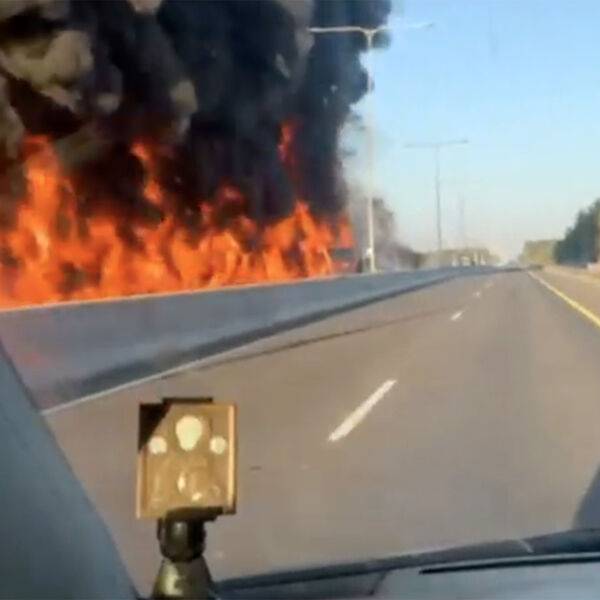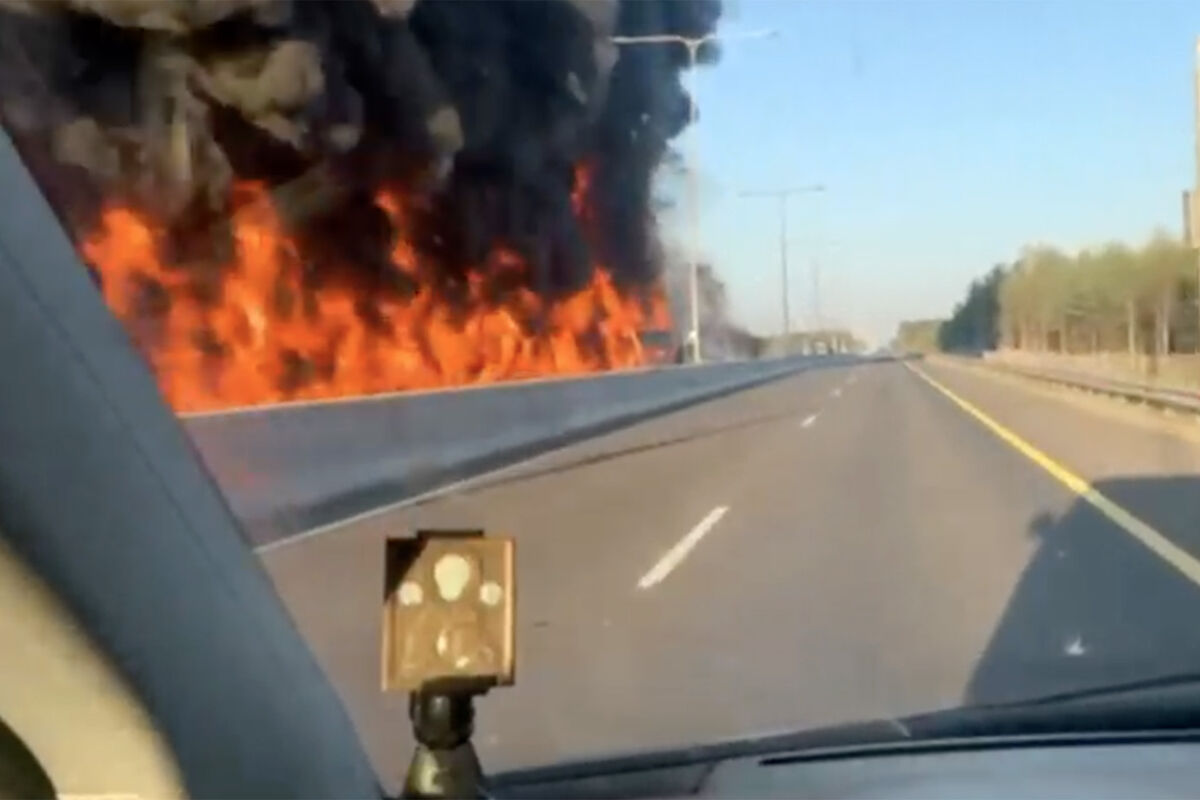 На опубликованных кадрах видна стена огня, которая образовалась из взорванных машин. Также на видео слышны взрывы.