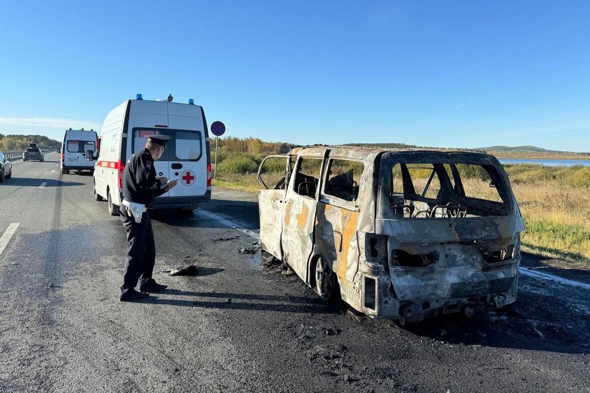 ДТП произошло утром 28 сентября, микроавтобус ехал из Екатеринбурга в сторону Казахстана. Экстренные службы быстро ликвидировали возгорание.