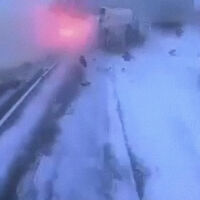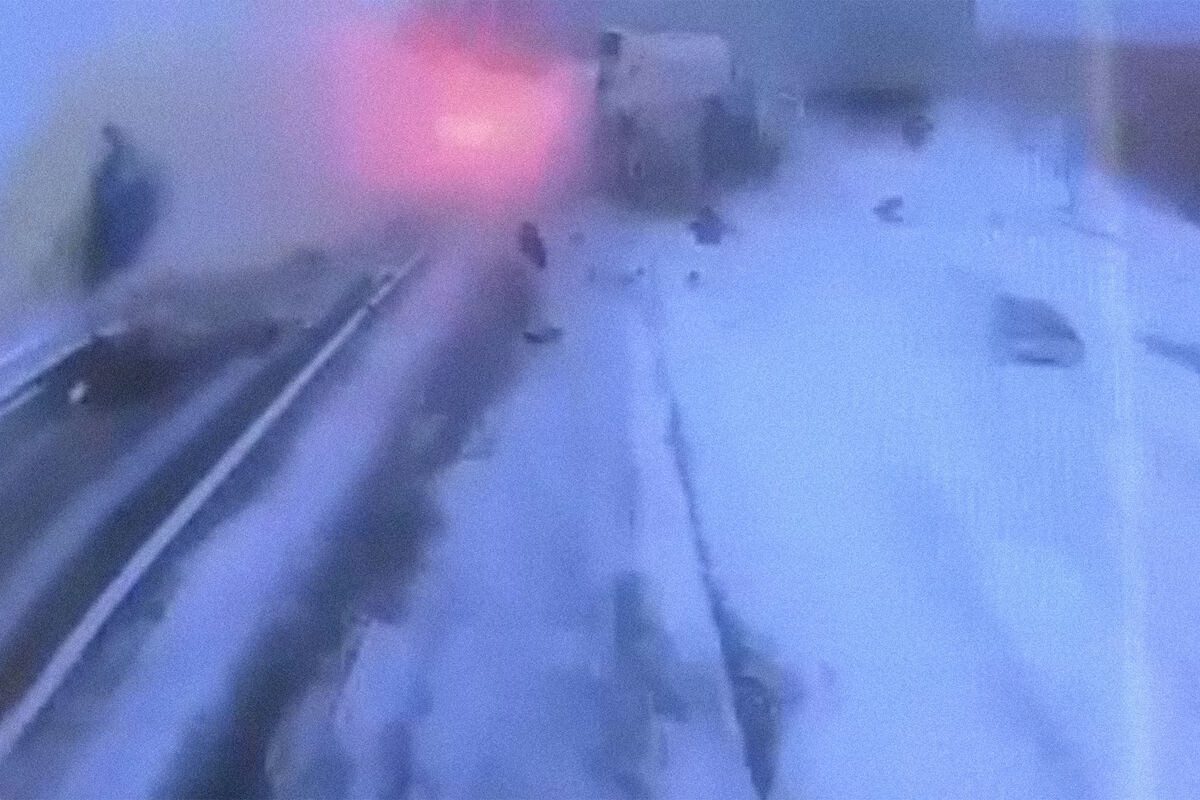 На опубликованном полицией видео видно, что большегрузную фуру развернуло поперек дороги и в этот момент в нее врезался другой грузовик. От удара у тягача фуры оторвало кабину, возникло пламя. После этого в нее врезался третий грузовик. Груз из разбитых машин рассыпался по дороге.