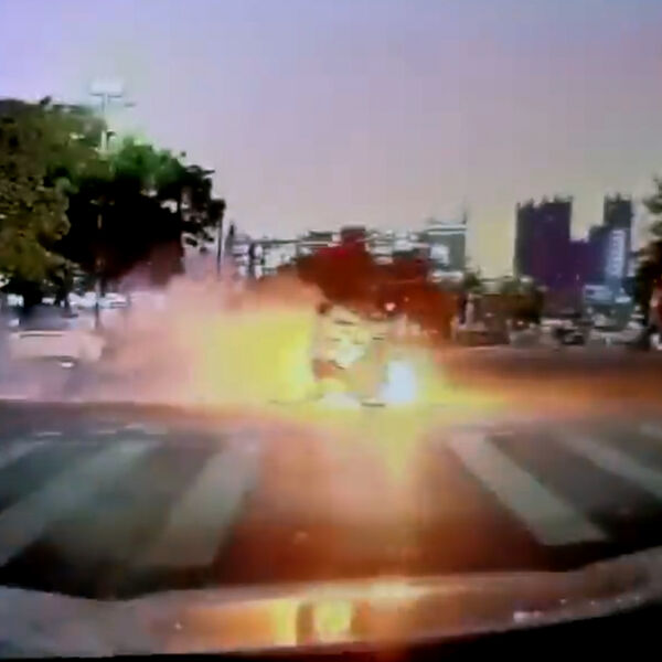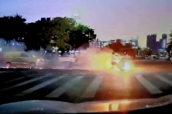 В Китае мужчине удалось спрыгнуть с горящего скутера. Кадры произошедшего опубликовали в сети.