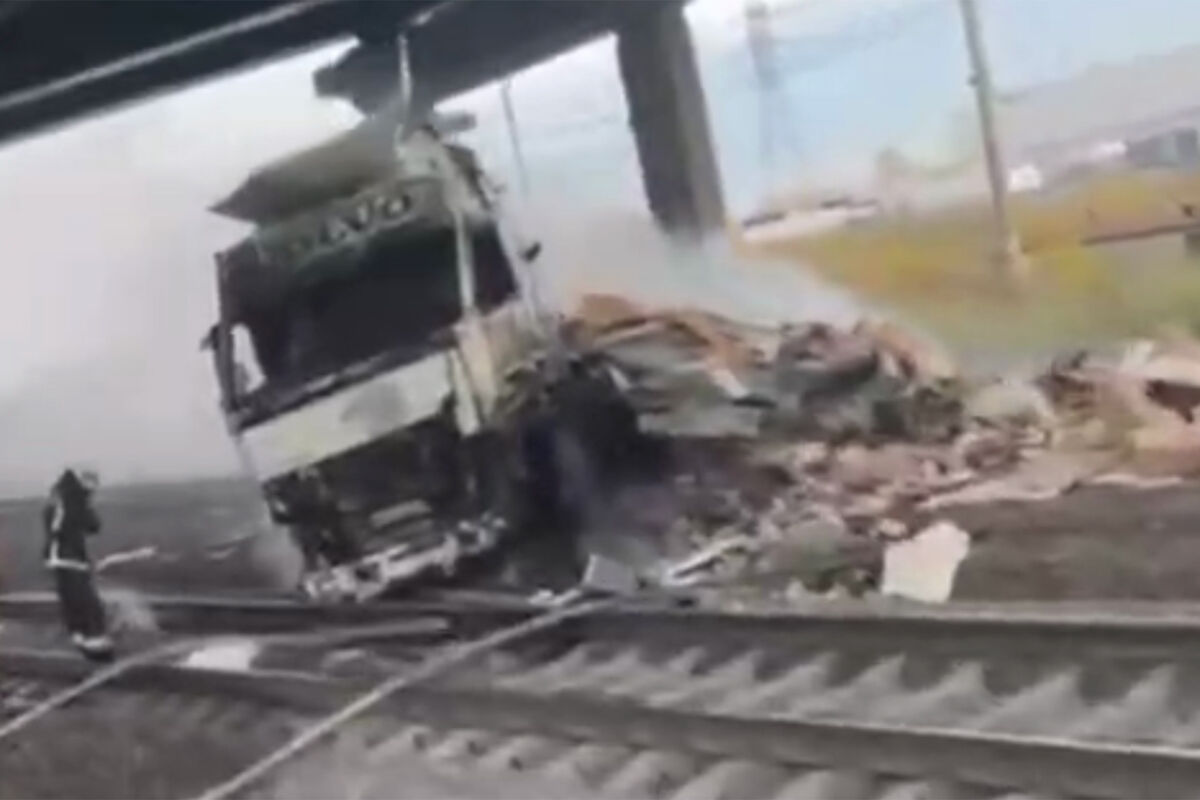 Дымящийся тягач Volvo, который упал на рельсы с моста под Санкт-Петербургом, сняли очевидцы на видео. Кадры выложил Telegram-канал «Мегаполис. ДТП и ЧП. Санкт-Петербург. Питер».