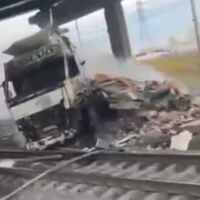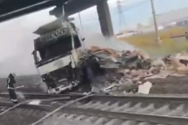 На видео попал тягач Volvo, рухнувший с моста на рельсы под Петербургом