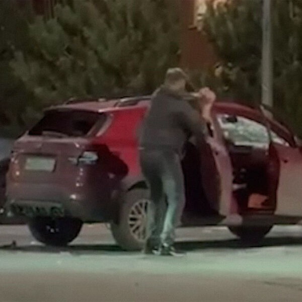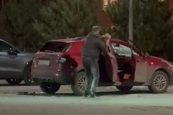 На кадрах видно, что у дома припаркован кроссовер красного цвета с открытыми дверями. Мужчина нанес несколько ударов по пассажирским дверям, а затем по зеркалу и фарам. После этого он обошел автомобиль и повредил его левую сторону.