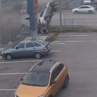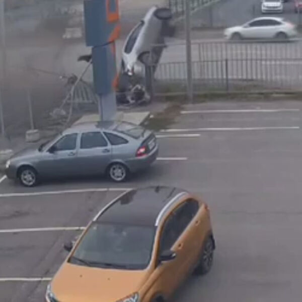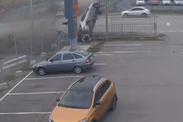 В результате она ударилась о забор автостоянки, несколько раз перевернулась в воздухе и осталась лежать на боку на проезжей части. Человек, выпавший из авто в момент удара, встал на ноги.