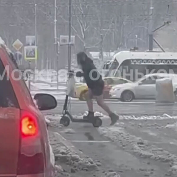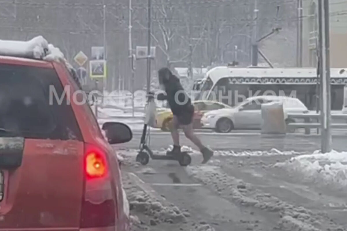 В столице сняли на камеру женщину, которая решила прокатиться на выключенном электросамокате в метель. Кадры опубликовал Telegram-канал «Что там в Москве?».
