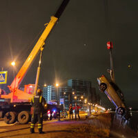 Автомобиль подняли из воды при помощи автокрана.