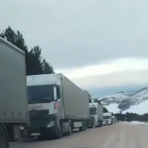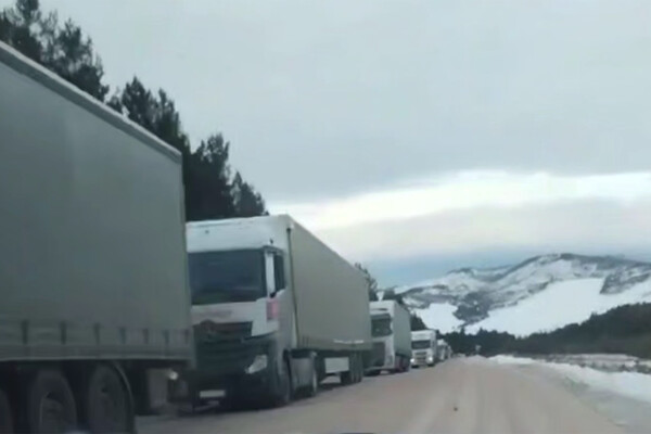 На видео записи автомобилистов с места событий видно, как до сотни большегрузов стоят на дороге и не могут начать движение из-за риска опрокидывания на обледенелой трассе.