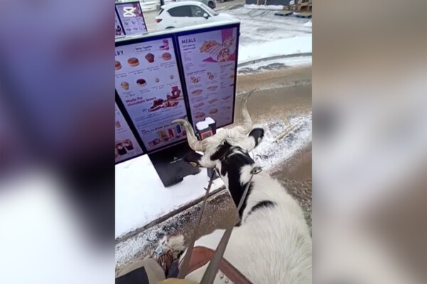 На кадрах видно, что девушка подъезжает к автокафе на быке. В окошке выдачи заказов сотрудники предприятия снимают происходящее на телефон. Канадка получает свой заказ и делится едой с питомцем.
