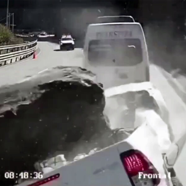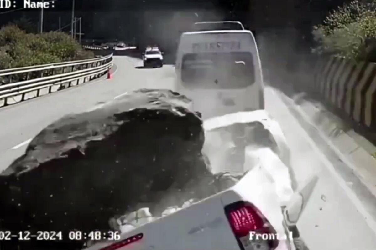 На кадрах видно, как на припаркованный автомобиль, в котором сидят люди, с горы падает большой камень. Раздавленная машина падает на бок, а впереди стоящий автобус отъезжает от места происшествия.