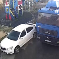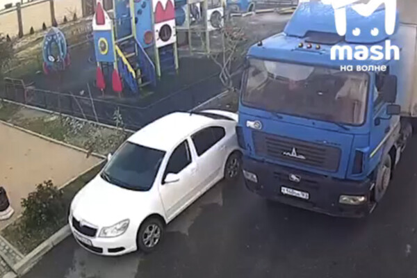 Инцидент запечатлели уличные камеры. На кадрах видно, как фура едет по двору, задевает зеркало белого автомобиля Skoda и уезжает. Также на видео сняли продавленный асфальт.
