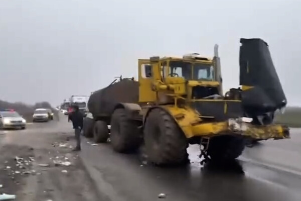 У грузовика разбито лобовое стекло и сильно поврежден полуприцеп. У тяжелого трактора, который ехал с прицепом-цистерной, разбит бампер и погнуто правое переднее крыло.