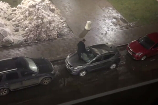 На видео показано, как мужчина топчет ногой лобовое стекло. Также у машины смята крыша. О причинах такого поведения не сообщается.