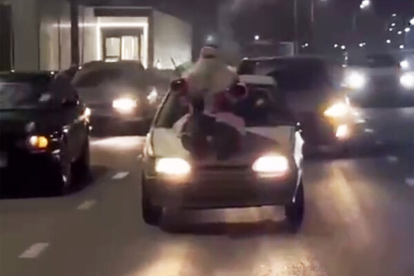 На размещенных кадрах видно, что Дед Мороз сидит прямо на капоте движущейся Lada и держит в двух руках петарды.