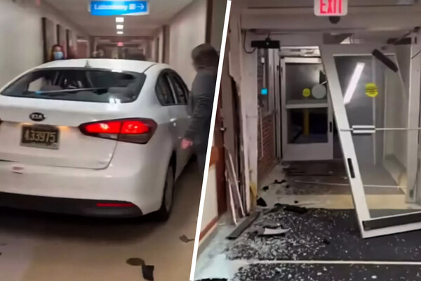 Инцидент произошел в Бриджтоне, штат Нью-Джерси. Водитель белого седана протаранила двери больницы и проехала около 20 метров по коридору. Охранник лечебного учреждения успел отпрыгнуть и избежать наезда, он получил легкую травму.