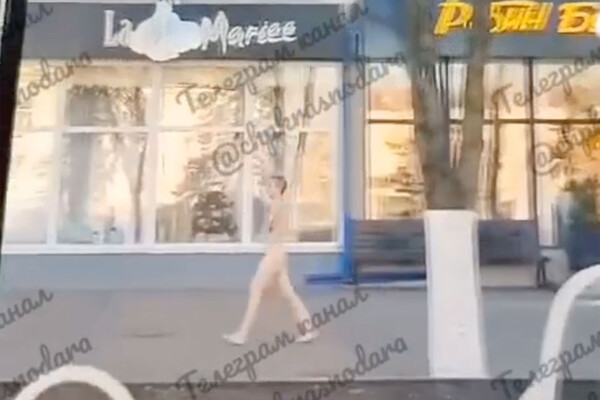 Несколько очевидцев запечатлели происходящее на видео. На первой записи, сделанной из автомобиля, видно, как женщина без одежды и обуви идет по пешеходному переходу, закрывая себя руками. На следующих кадрах краснодарка уже ходит по улицам города.