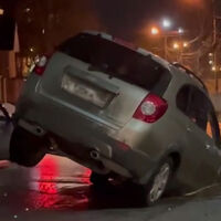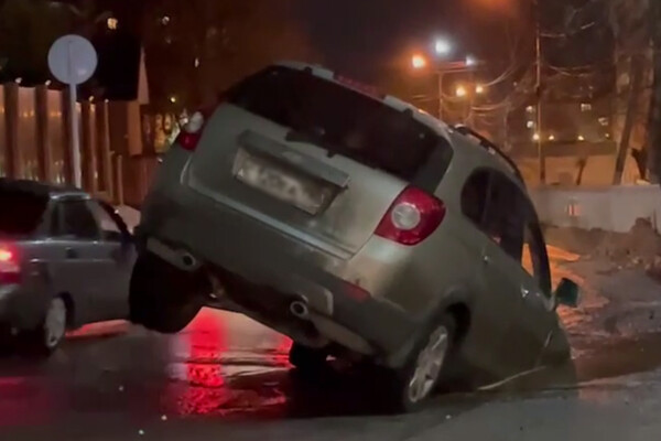 Очевидцы запечатлели инцидент на камеру. На кадрах видно, как передняя часть автомобиля провалилась в яму и застряла, при этом машина наклонена вперед таким образом, что заднее левое колесо не касается земли.