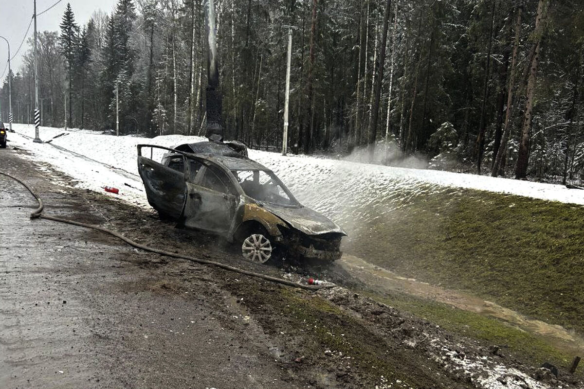 «Сегодня в 14.20 на 107 км. автодороги «СПБ-Псков» неустановленный водитель, управляя автомобилем Mazda 6, не справился с управлением, съехал на обочину и врезался в столб, после чего автомобиль загорелся», — говорится в публикации.