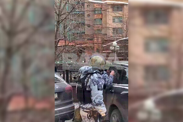 На опубликованных кадрах видно, как взрывотехники с собакой проверяют припаркованные возле здания машины. Они осматривают автомобили и заглядывают в окна.