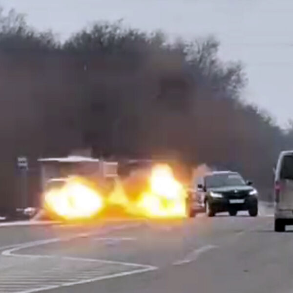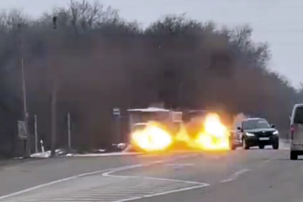 На кадрах видно, что квадрокоптер приближается сзади к белой «Ниве» и темному кроссоверу, едущим по трассе. За ними у автобусной остановки припаркован «КамАЗ» с кабиной цвета хаки. Беспилотник врезался в проезжую часть между двумя легковыми машинами и взорвался. Прямо перед взрывом водитель темного кроссовера резко повернул влево и ускорился, чтобы не попасть под удар.