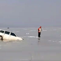 На первом видео видно, как колеса и передний бампер белого легкового автомобиля уже ушли под воду. Также лед треснул и под машиной такси, рядом с которой ходит мужчина. На следующих кадрах — красный автомобиль, который почти полностью погрузился под воду.