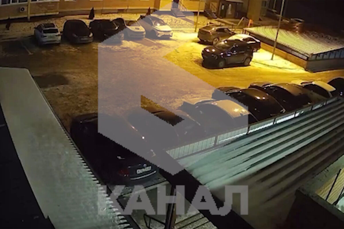 Уличная камера запечатлела инцидент. На кадрах видно, как человек падает на припаркованный легковой автомобиль, у которого от удара включается сигнализация.
