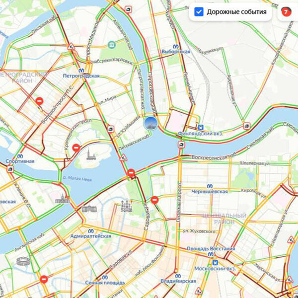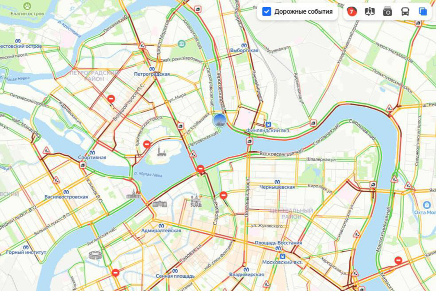 «Предпраздничные пробки сковали Петербург. На часах 15:50, а город уже погряз в семибалльных заторах», — говорится в сообщении.