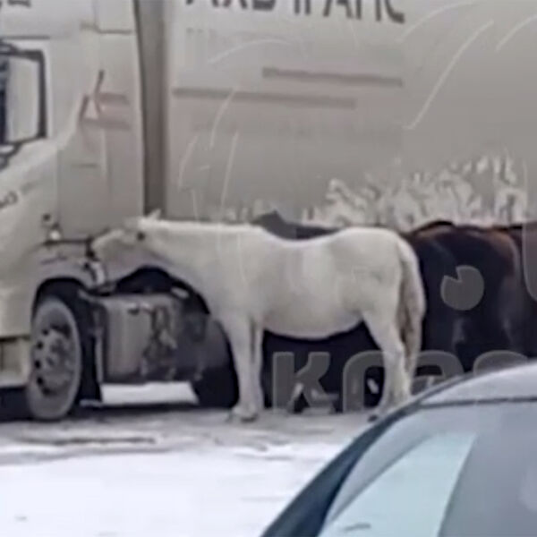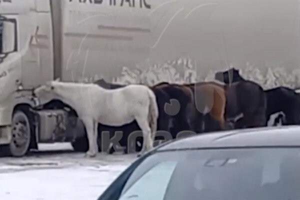 Очевидцы сняли инцидент на камеру. На кадрах видно, что несколько лошадей стоят возле грязной фуры и облизывают ее. При этом на транспорте видны чистые места.