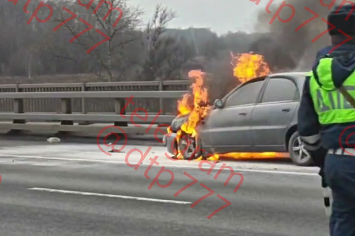 Telegram-канал «ДТП и ЧП Москва и МО» публикует видео инцидента. На кадрах видно, как на обочине горит серый легковой автомобиль.