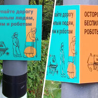 «Уступайте дорогу пожилым людям, детям и роботам», — написано на табличке.